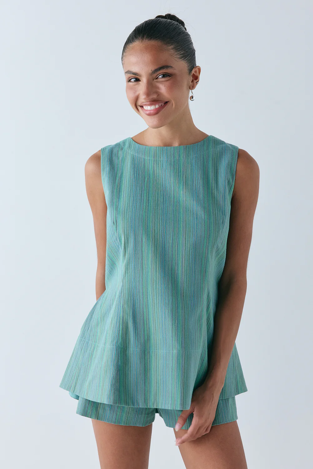 The Freja Tunic Top is cut from 100% cotton in a multicoloured stripe, grounded in green, with a relaxed tunic-length fit. Designed with an open back, adjustable waist tie and adjustable back strap, it’s lined through the front for coverage. A directional piece that pairs with the matching shorts.
