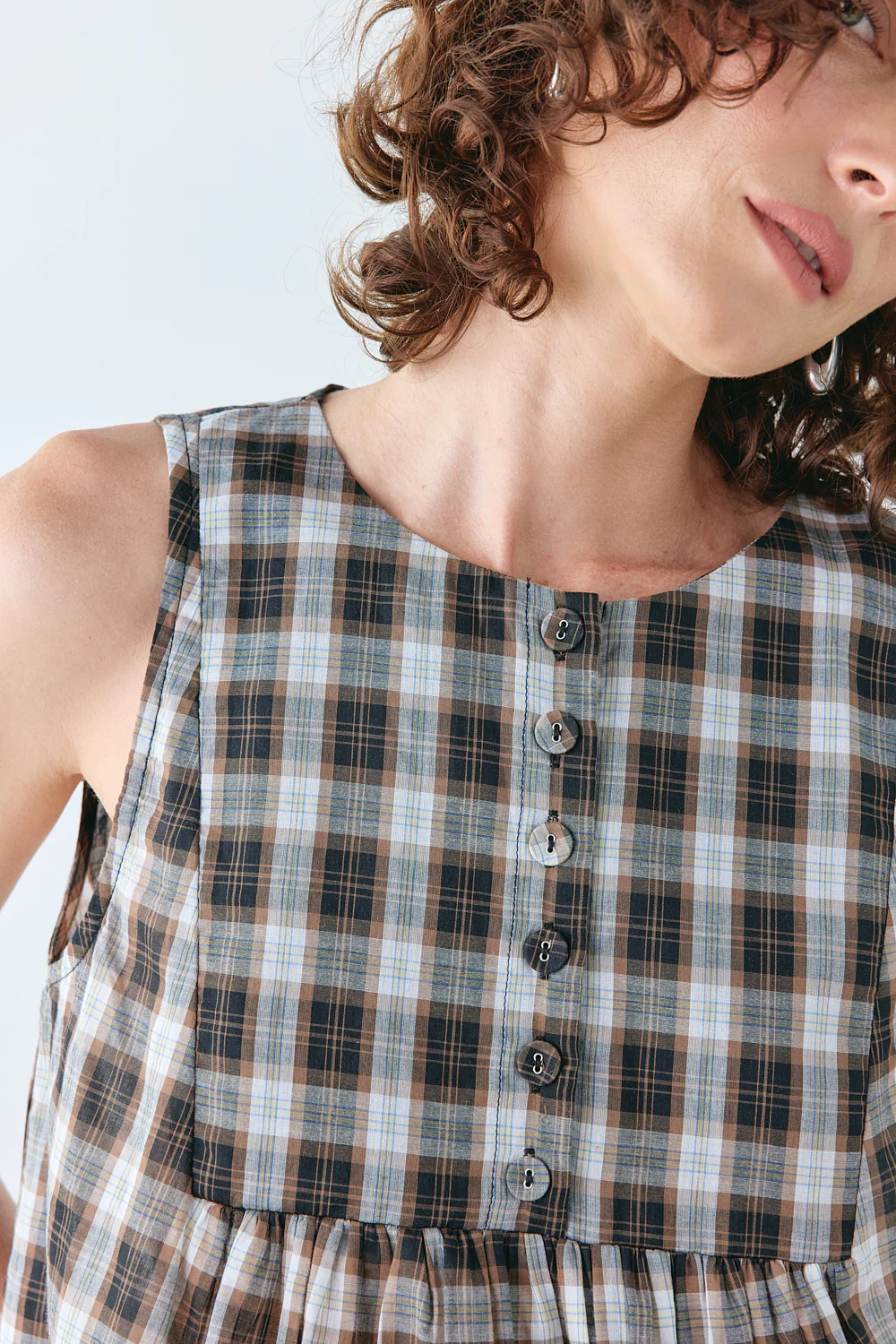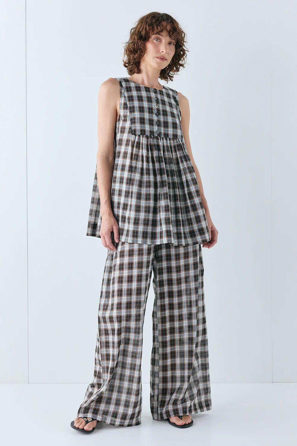 The Juliet Tunic Top is cut from lightweight cotton with a soft check in a shape that feels both relaxed and refined. Gathering at the front and a pleat at the back create subtle volume. Pair with the matching pants for a set that’s equal parts easy and intentional.